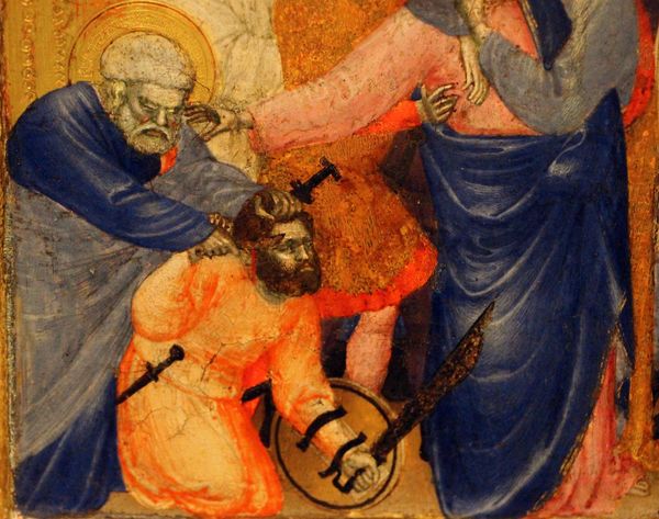 Editor: This tempera painting, "Martirio di S. Caterina" by Giovanni da Milano, created around 1355, depicts the martyrdom of Saint Catherine. The raw emotion feels striking, almost theatrical in its presentation, heightened by the figure posed to execute her. What can you tell us about how the composition contributes to the impact of this piece? Curator: Let's begin with the compositional structure. Note the flattening of space characteristic of Gothic painting; the gold background denies depth and focuses attention on the figures. Giovanni's deployment of line is also of great importance: examine the rigid, almost angular drapery. Does that strike you as purposeful? Editor: It does seem deliberate. It makes the scene appear almost frozen, highlighting a sense of austere inevitability, despite the violence implied. Curator: Precisely. Consider, too, the stark contrast in color—the pale pinks and blues of Saint Catherine's garments against the earthy tones of the executioner and the gold backdrop. Color functions here to separate the sacred from the mundane. What is your reaction to the executioner? Editor: He seems secondary. His back is turned; there is no facial expression visible, he could almost be any man. All attention is on the subject, the textures, colors and pose create a tension. Curator: Indeed. Notice the geometry of the forms, almost crystalline. There's a formal elegance at play that elevates the gruesome subject matter. Even within the depiction of violence, there's visual control that brings a measure of refinement. The Italian Renaissance is visible through that control, as are the later paintings inspired by Gothic art. Editor: This focus on form and color truly reveals a painting full of details unseen at first glance. I realize now that the beauty is intrinsic and almost devoid of the depicted martyrdom. Curator: Agreed, it is through this meticulous attention to visual detail that we unlock the artwork's complexities. This analytical approach reveals an elegance that shapes and controls the gruesome theme of the painting.