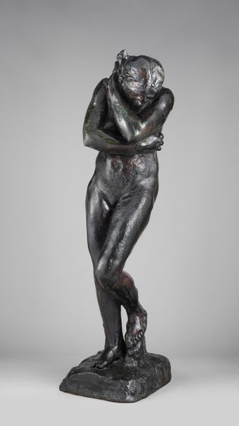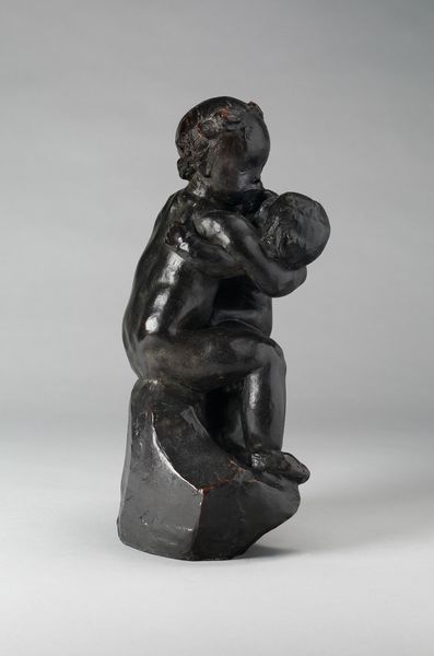 Curator: George Minne’s bronze sculpture, "Kneeling Youth with a Shell," at the Harvard Art Museums, presents a striking image. The figure is hunched, embracing the shell as if seeking solace. What's your immediate take on it? Editor: It's undeniably melancholic. The posture, the downward gaze—it speaks of vulnerability and perhaps a search for something lost or unattainable. Is there something more to the shell as an object? Curator: The shell could be read as a symbol of protection but also of emptiness. Minne often explored themes of suffering and introspection, and here, the boy’s posture emphasizes a turning inward. The bronze itself, with its rough texture, adds to this feeling. Editor: Absolutely. The material itself feels raw, almost as if reflecting the boy’s emotional state. The crafting seems intentional in highlighting the physical process and the weight of the material on the figure's form. Curator: Minne's work often blurs the lines between idealized form and human frailty. This piece reminds us of how we seek comfort in tangible objects, and how symbols can amplify personal emotions. Editor: It makes me think about how external objects like the shell can be internalized, becoming vessels for our own inner worlds. Curator: Precisely. Ultimately, the sculpture becomes a mirror, reflecting our own searches for comfort and meaning. Editor: Yes, it's a potent reminder of the complexities of human emotion and our dependence on both material and symbolic comfort.