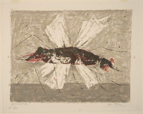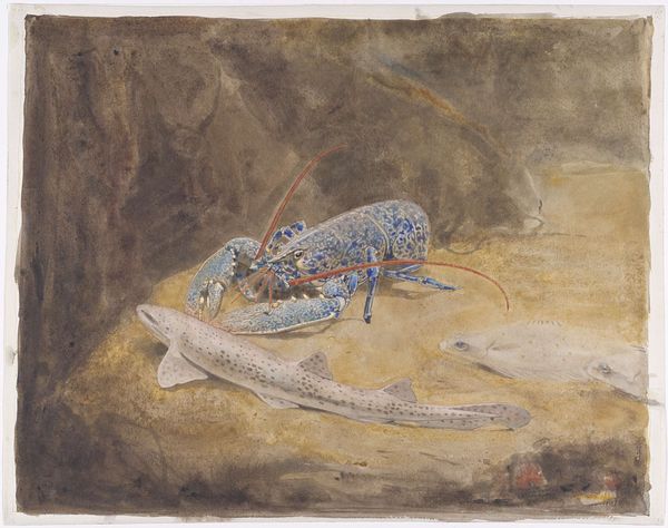 Editor: So, this is Mahonri Young’s watercolor, "European Lobster." It's a pretty straightforward depiction, almost scientific in its detail, but there's also a lightness to it. What strikes you when you look at this piece? Curator: It’s funny, isn’t it? How Young captures the lobster with such precision, yet the wash of color gives it this ephemeral quality. It's as if he's saying, "Here's the reality, but isn't it also kind of magical?" I wonder if he was thinking about its vulnerability even as he immortalized it. Editor: I hadn't considered that juxtaposition, but that makes sense. It's more than just a lobster; it's a moment captured. Curator: Precisely! And perhaps a little meditation on existence itself.