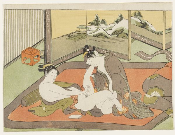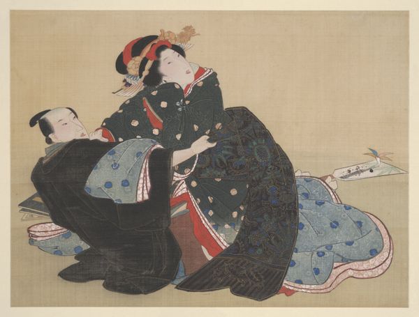 This print, Vrijend paar, was made by Kikugawa Eizan in Japan, using woodblock printing. This is a process by which an image is carved into the surface of a wooden block, with the remaining areas being inked and printed. Consider the intense labor involved in this process. Each color requires its own block, demanding precision and skill. The lines you see here have been carefully carved and inked, translating the artist's vision into a repeatable image. Woodblock prints like this one were a key part of the burgeoning consumer culture of Edo-period Japan. They were relatively inexpensive, and met a demand for images of desirable subjects. The production of such prints involved a complex division of labor, with specialized artisans for carving, printing, and publishing. This speaks to a highly developed system of craft production embedded within a wider social and economic context. So, next time you look at a print, remember the hands that made it, and the world in which it was created. It’s never just an image.