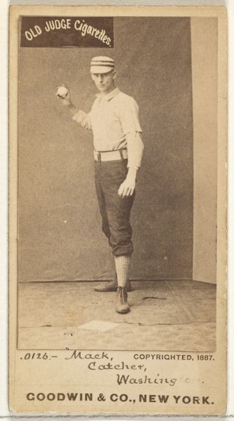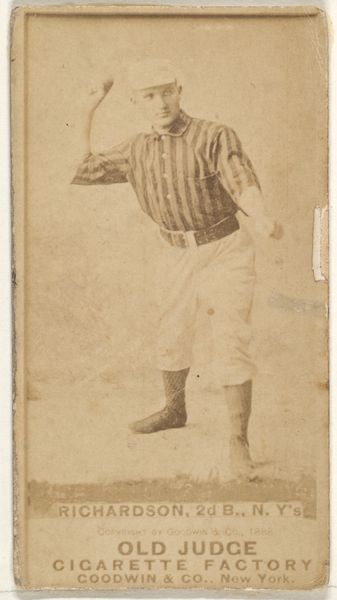 This photograph of John J. "Egyptian" Healy, pitcher for the Washington Nationals, comes from the Old Judge series of baseball cards, produced around 1887 by Goodwin & Company for Old Judge Cigarettes. These cards were a marketing strategy to promote tobacco consumption, and they also captured a moment when baseball was becoming America’s pastime. Healy’s nickname, “Egyptian,” reflects the common, though problematic, use of exoticizing nicknames in that era. The image portrays Healy in action, his body in mid-motion, ready to throw. What does it mean to capture the image of a working class man at play? The image suggests both the increasing visibility and value of athletic skill in American culture, and how it intertwined with advertising and consumerism. These cards provide a glimpse into the cultural values, commercial strategies, and social dynamics of late 19th-century America, revealing a layered picture of identity, sport, and commerce.
