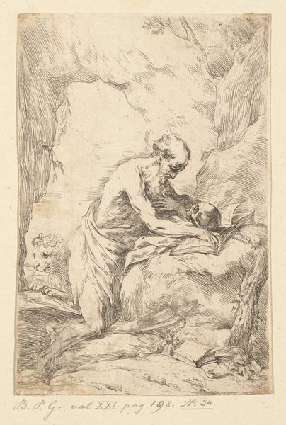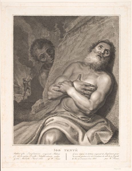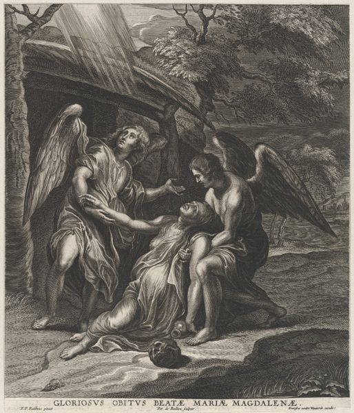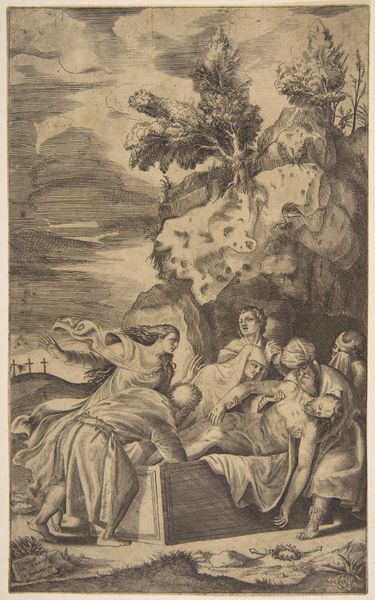 Curator: Here we have "Dead Christ Lamented by an Angel," an engraving by Jan Muller, dating back to somewhere between 1590 and 1600. Editor: Immediately, I'm struck by the tonal contrasts. The intense cross-hatching creates deep shadows that frame Christ's pallid body and the angel's luminous form. There’s a real theatricality at play. Curator: Precisely. Notice how Muller uses line to define the forms, particularly in Christ's musculature and the angel's drapery. The artist's use of chiaroscuro intensifies the emotional weight. The textures achieved, especially the folds of the cloth supporting Christ, highlight the expressive capacity of engraving. Editor: This print echoes wider anxieties about death and salvation. The very pose of Christ – limp, yet somehow elevated – alludes to the theatrics surrounding sacrifice so prevalent at the time. A theatrical way of emphasizing themes of grief, redemption, and perhaps even divine intervention, all playing out on the public stage of religious art. Curator: Indeed. Muller also emphasizes the narrative through the use of iconographic symbols. The hanging lamp, shedding light on the scene, represents divine illumination in the face of earthly sorrow. It reinforces the sense of a sacred, transformative moment. The lines lead the eye, drawing the viewer to interpret, through contemplation, what is being displayed here. Editor: The placement within the Metropolitan Museum contextualizes its role. Once intended for circulation as a devotional object, now it invites viewers to engage with questions of faith and artistic skill. Consider who was seeing it, why, and the spaces—homes, chapels, private collections—where these images operated. The scale of the engraving lends itself to portability, and an intimate viewing experience. Curator: Looking at the composition closely, one notices that the lines of the landscape draw the eye inexorably back toward the figure of Christ. He's not merely a subject; he is the focal point upon which all the formal decisions seem to hinge. Editor: And it compels us to confront, still, the spectacle of mortality, rendered in this precise historical and aesthetic framework. Curator: Yes, an image intended to spark contemplation but ultimately serving a public function of propagating a very precise version of grief. Editor: A rather evocative piece.