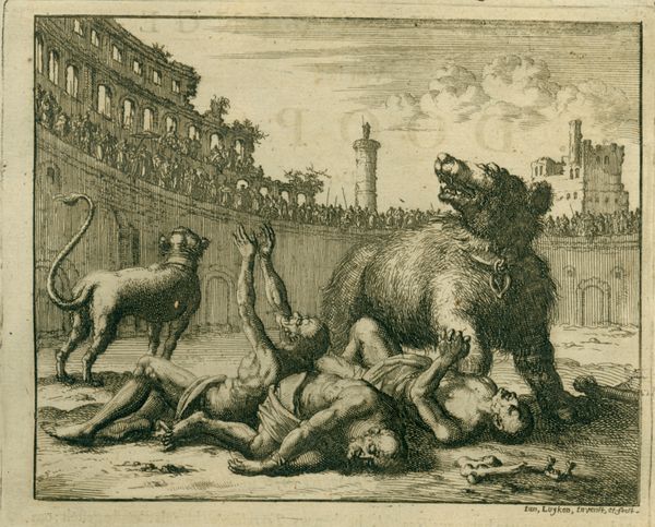 This engraving, "Venationes ferarum avium, piscium...", was created by Jan van der Straet, called Stradanus, sometime between 1543 and 1605. It plunges us into the spectacle of animal hunts, a popular form of entertainment during the Renaissance. Beyond mere entertainment, these displays were deeply intertwined with power dynamics. Consider the inscription: "Magnus Alexander populo spectacula praebet," referencing Alexander the Great presenting spectacles to the people. The implication being that the ruling class of the time, like Alexander, could command nature and entertain the masses. Look at the dead elephant in the foreground and the menacing lion. These animals become symbols of conquered lands, their display reinforcing the dominance of European power. What does it mean to see a dog attacking the lion? Think about the relationship between humans and animals, and how such spectacles reflect and shape our understanding of the world. The emotional tension between violence, spectacle, and control makes this piece deeply unsettling.