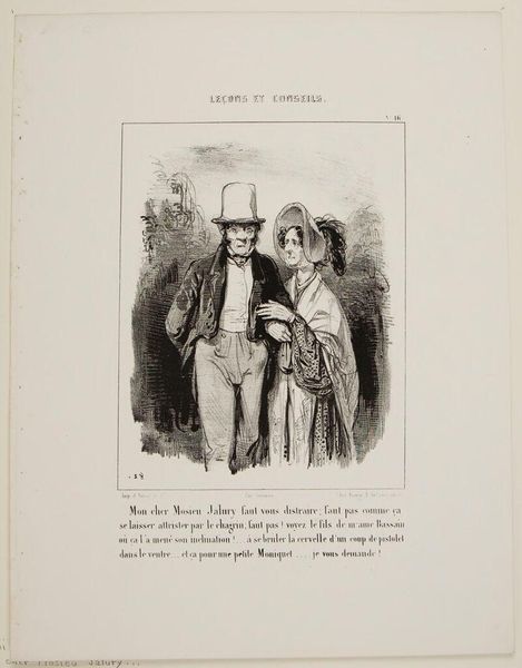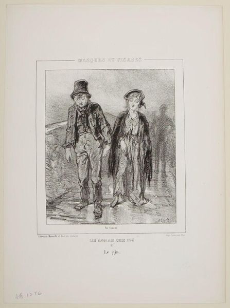 Editor: This is Paul Gavarni's lithograph, "La "biche" au Bois," from the series "Masques et Visages." It gives off a feeling of social commentary. What kind of symbols do you see operating in this image? Curator: The title itself, "doe in the woods," is a loaded symbol. The doe is often associated with innocence and vulnerability. Gavarni uses visual shorthand to critique societal power dynamics, does he not? Editor: That makes a lot of sense. I hadn't considered the title so literally. Curator: Think about the male figure’s towering top hat and stern expression. Does it convey anything particular? Editor: It suggests the societal pressure faced by women. I never thought about lithographs having all these hidden stories to tell! Curator: It is these untold stories which reveal visual culture's imprint on our minds.