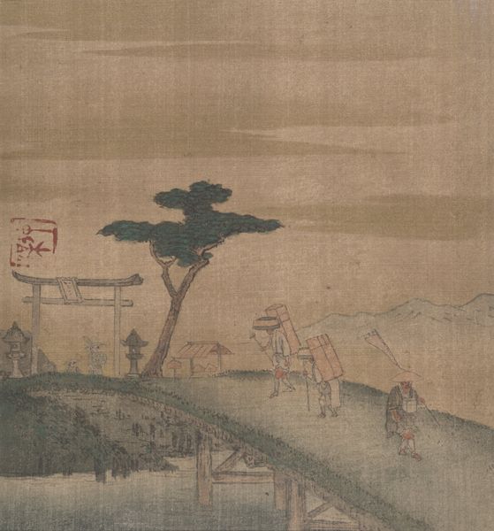 This print, possibly by Hokei, depicts a scene from the Tokaido Road in Japan. The Tokaido was more than just a road; it was a vital artery of commerce, culture, and governance during the Edo period. By representing it, artists were able to participate in a booming tourist industry and expanding print market. This image creates meaning through visual codes, cultural references, and historical associations. Its serene landscape contrasts with the bustling reality of the Tokaido. The figures, dwarfed by the landscape, remind us of the human element within broader social structures. Was Hokei critiquing or celebrating this established order? By studying travel guides, government records, and other prints from the era, we can appreciate how artists shaped perceptions of Japanese society and geography. Art is not made in a vacuum; it's contingent on social and institutional contexts.