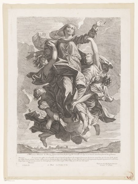 Curator: Look at the sky, isn’t this monochrome engraving striking? Editor: It is indeed, with its swirling clouds and dramatically posed figures, creates a palpable sense of dynamism despite its muted palette. Curator: The artwork here, made circa 1760-1800, is titled "Saint Martin, on horseback, giving his cloak to a beggar, angels overhead". It is believed to be created by Giuliano Traballesi. Editor: I’m immediately drawn to the composition—how Traballesi directs the viewer’s eye. The beggar, St. Martin and his steed occupy a large proportion of the image but the cherubs draw your attention skyward. It provides a visual hierarchy but I’m curious about how its history shapes our viewing experience. Curator: Well, in its time, art served very specific functions in society—this Baroque artwork in particular. Not only as visual delight, but a piece to act as moral instruction, particularly within a religious context. This image obviously serves as propaganda for religious institutions through historical painting. Editor: The narrative is further reinforced by the figures in the upper register of the picture frame as a type of divine judgement. They almost look like heavenly hosts celebrating the altruism of the armoured protagonist on horseback. What is less clear is how the historical context or social function might further our interpretation of the use of monochromatic palettes. Curator: Baroque engravings often utilized stark contrasts to highlight the drama. This also reflects printing capabilities of the time as it has everything to do with availability and the distribution of information. These pieces had to have mass appeal, be easily legible and, moreover, quickly consumable by the viewer in order to spread ideological messaging across Europe. Editor: True. Now that you mention it, this explains why there is a reduced reliance on subtle variations in light and shade. That also influences my experience of the scene because it feels rather emotionally flattened despite its action and moral grandstanding. Curator: Interesting, looking through the socio-political lens illuminates the image in a different way. This highlights that Baroque engraving was more about broad impact and less about personal nuance. Editor: Right, thanks for shining a light on those crucial nuances that the social climate brought to bear upon the artwork and, consequently, the evolution of the style.