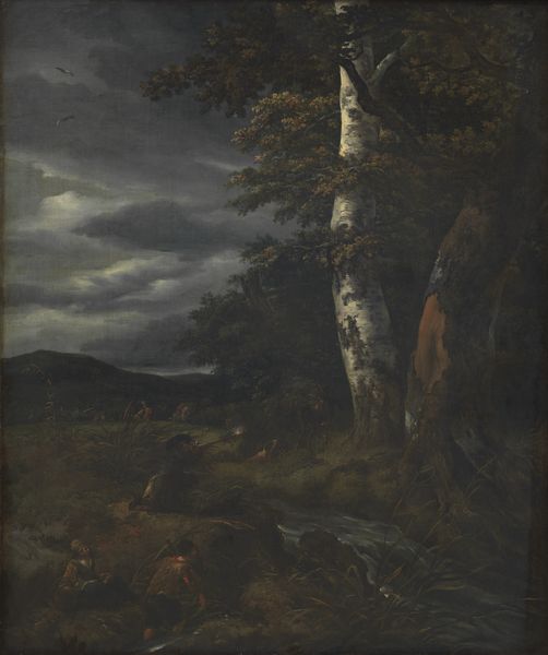 Editor: This is Alessandro Magnasco’s oil painting, "Carthusian Monks in a Landscape," dating to the first half of the 18th century. I find it kind of gloomy, the figures seem lost amidst this dark landscape. What draws your attention when you look at this piece? Curator: What immediately strikes me is Magnasco’s theatricality. Think about the Carthusian order: known for their solitude, their almost radical withdrawal from society. Magnasco's painting presents a constructed version of this piety for public consumption. Editor: Constructed how? Curator: Well, consider the art market of the time. Images of religious devotion were popular, providing wealthy patrons a safe way to demonstrate virtue. The dramatic lighting, the expressive, almost caricatured figures… it all amplifies the emotional intensity for a viewing audience. Does that resonate with what you initially perceived as gloom? Editor: It does, now that you mention it. It feels less like simple sadness and more like a performance of piety. So, the artist is shaping an image of monastic life to be palatable to those *outside* that life? Curator: Precisely. This painting tells us less about the actual lives of Carthusian monks, and more about the societal expectations and the commodification of religious experience during the Baroque period. Consider also where a piece like this might have been displayed. Probably in a private collection, furthering the patron's reputation. Editor: That’s a totally different way to consider the work, focusing on who it’s really *for*. I guess I was so focused on the "mood" of the image, I didn't consider the economic and social factors at play. Curator: And that’s why considering art historically allows us to decode not just *what* we see, but *why* it was made to be seen that way. It shifts our focus from a purely aesthetic judgment to a critical understanding of its place in a specific historical context.