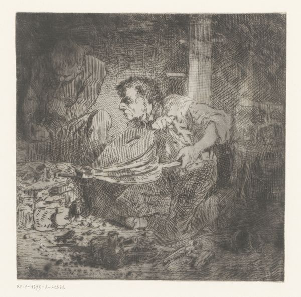 Editor: Here we have Alphonse Legros’s etching "The Prodigal Son, 3rd plate." The figure's posture and tattered clothing evoke such a powerful sense of remorse and destitution. What stands out to you in this depiction? Curator: It's crucial to consider how images like this functioned in their historical context. Biblical scenes were not simply illustrations; they carried immense cultural weight. Legros’s print participates in a long tradition of representing religious narratives, but it also speaks to broader societal concerns about morality and redemption. Think about the intended audience – were these prints meant for private devotion, or were they circulated more widely, shaping public perceptions of these stories? Editor: That’s a great point. I hadn't really thought about how its accessibility as a print might shape its meaning. The emotional intensity seems dialed up here; do you see any ways that Legros manipulates visual elements to get an emotional response? Curator: Consider the role of the landscape. It’s not just a backdrop, it is a crucial visual and metaphorical element, the trees framing the figure and fencing in the background acting like social and psychological restraints. How does the rendering, achieved through delicate etching, contribute to the emotional tenor of the work? Does it emphasize his vulnerability, perhaps mirroring social structures that can leave individuals feeling exposed? Editor: Yes, the contrast between the textures emphasizes his isolation! I was focused on his figure. Now, understanding the historical context and noticing how it enhances certain themes, this piece holds so much more meaning for me! Curator: Exactly! Examining how these images were consumed helps us to see them not just as representations, but as active participants in shaping beliefs. And, conversely, how established beliefs inform artistic choices.