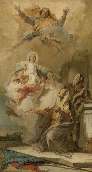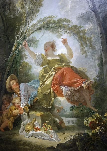 Curator: Allow me to introduce "La bascule", often translated as "The See-Saw" or "The Swing," a work attributed to Jean-Honoré Fragonard, a prominent figure in the Rococo movement. Editor: Well, right off the bat, it has this light, breezy feel—a little naughty, a little comical. She’s flying high, he’s doing the work. Typical, right? Curator: Ha! I love how you went there immediately. In terms of the materials and production, consider the feathery brushwork. Fragonard builds up layers of oil paint to capture the shimmer of silk and the dappled light filtering through the trees. Look closely, it is so luscious. Editor: Luscious and loaded. The composition feels intentionally unbalanced, no? All this rococo froth disguising a blatant imbalance of labor, pleasure... look at the young child. We get a glimpse of generational exploitation perhaps? And I'd bet the materials themselves were rather exclusive. Where were they sourced? How were the pigments processed? What was the painter's studio structure, the role of apprentices etc.? All questions behind the pleasure... Curator: Interesting—it wasn’t meant to be subversive. You've got this game of love being played out. She's reaching, playful. The swain looks up, almost worshipful! Even the slightly muddied palette helps evoke this fleeting, dreamlike moment. A love story caught mid-air. Editor: That "fleeting moment" came to be thanks to extensive labor, from pigment-making to priming to model sitting, even the labor needed to uphold such a "leisurely moment." It has real consequences for somebody. The lack of defined edges makes the brushstrokes the focus—flaunting the painter’s technique, distracting us with the visible labor. Look there’s even what looks to be some visible ground at bottom? Maybe that speaks to something of a raw and rudimentary process… Curator: And yet there is this overwhelming sense of pleasure, of the fleeting joys in life, like a sweet whisper lost on the wind... Editor: Well, for me the real revelation here isn't about whispers, but who gets to shout and who's left hushed by material conditions. Curator: A stark reminder that behind every grand gesture and painted fantasy lies an entire unsung reality. Editor: Right, but even uncovering that reality is part of our job, don't you think? Otherwise we risk fetishizing mere technique!