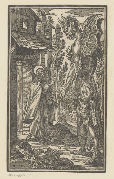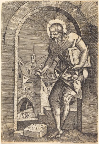 Editor: This engraving, “Saint Jerome Kneeling Before a Crucifix,” comes to us from Marcantonio Raimondi and dates between 1495 and 1532. There’s a real sense of isolation and penitence about the figure and his location. What stories can we unpack from this work? Curator: That feeling of isolation is key, but let’s also consider *who* is being isolated. Here we have Jerome, a figure who translated the Bible into Latin. What does it mean to see him removed, physically and symbolically, from the societal structures that would have relied upon his knowledge? The Renaissance was hardly a monolith, and representations like these are actively wrestling with how we perceive authority, and indeed access to divine wisdom. What does the introduction of the lion figure signify to you? Editor: He seems pretty docile. Like he’s being domesticated, or has become a companion to Jerome in this secluded existence. Curator: Exactly! And isn't the act of taming, of translating nature to fit a human purpose, the very project that Saint Jerome undertook with language? Both he and the lion are, in effect, being reformed. The crucifix becomes this point of… Editor: … Intersectionality? It connects man, animal, and the divine. Wow, I didn't see all of those connections. Thank you. Curator: It's all there, embedded within the print’s historical moment, pushing us to reflect on faith, knowledge, and their accessibility within society. Understanding this intersectionality reveals powerful questions about authority and access. Editor: Definitely. It gives me a richer understanding of the Reformation. Thanks again!