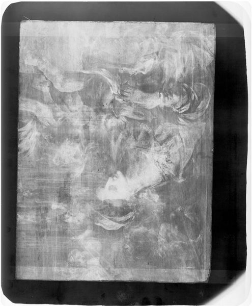 Curator: Jack Gould’s small gelatin silver print, "Untitled (mother chimp with baby chimp)," is a poignant study in maternal intimacy. What’s your initial reaction? Editor: The inverted tones create an eerie yet comforting glow around the pair. The rough texture of the photographic paper really emphasizes the physical connection. Curator: Absolutely. The piece invites contemplation on captivity, maternal bonds, and the ethics surrounding primates in research. It makes you wonder about power structures at play. Editor: I'm drawn to the film markings along the edge; they're a reminder of the labor involved in the darkroom and the material reality of the image itself. Curator: Indeed, those markings contextualize Gould's process, making it a layered narrative about our relationship to the natural world. Editor: Exactly, and I think this piece highlights the power of photography to document and commodify even the most intimate moments. Thanks for illuminating this with me. Curator: My pleasure. It seems Gould challenges us to look at how societal structures shape our understanding of animals, agency, and motherhood.