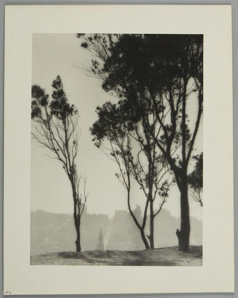 Editor: This photograph, "Untitled (Santa Monica)" by Bill Dane, captures a California beach scene. The black and white palette gives it a timeless quality. What cultural narratives do you see at play here? Curator: Well, the stark contrast and almost skeletal trees against the ocean invoke a feeling of resilience. Do you notice how the repetition of the trees might echo the recurring cycles of nature and human experience? Editor: I do. It's interesting to consider the enduring symbolism of trees as life and growth against the backdrop of the ever-changing sea. Curator: Exactly. Dane seems to use these contrasting elements to suggest a dialogue between permanence and transience, inviting us to reflect on our own place within this continuum. Editor: That's a perspective I hadn't fully considered. Thanks for pointing out the way these elements play together. Curator: My pleasure! It's always rewarding to uncover the layers of meaning embedded within an image.