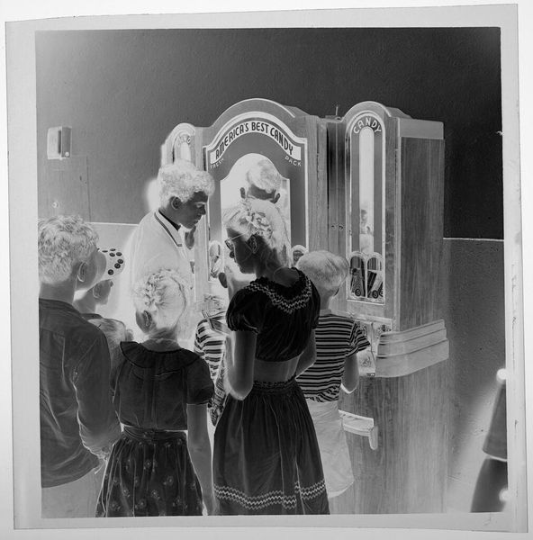 Editor: This photograph, titled "Untitled (two elderly women wearing hats standing and drinking tea)" by Jack Gould, features a seemingly reversed grayscale palette. It gives the photo an eerie feeling. What do you make of the composition? Curator: Observe how the luminosity is manipulated to create an inverted visual hierarchy. The photographic reversal emphasizes texture, line, and form over realistic representation. The tension between positive and negative space is heightened. Editor: So, it's less about what's depicted and more about *how* it's depicted? Curator: Precisely. Consider the interplay of light and dark – how does this manipulation alter your perception of the subjects and their interaction? Editor: I hadn't considered the interaction of positive and negative space before. I'll definitely look closer next time! Curator: A close reading reveals so much.