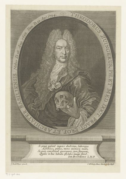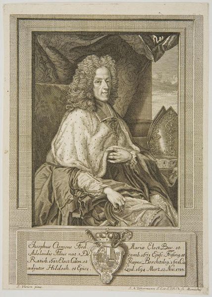 Editor: We’re looking at a rather regal portrait today: "Portret van Jozef Klemens, keurvorst en aartsbisschop van Keulen," created between 1715 and 1797 by Joseph Anton Zimmermann. It's an engraving. The detail is really quite something, although it's monochromatic. The frame within a frame gives a feeling of contained power. What compositional elements strike you the most? Curator: The linear precision achieved through engraving, dictates a sense of formal restraint, contrasting dramatically with the flamboyant baroque style inherent in the subject's attire and pose. Notice how the intricate details of the lace, wig, and ermine cloak are meticulously rendered, highlighting a play of light and shadow. The geometric structure of the frame acts as a visual counterpoint to the swirling lines of the drapery behind him. The relationship between these two contrasting elements create visual harmony. What semiotic meaning do you draw from the positioning of his hands? Editor: Hmm, his hands. One is resting on the chair, the other held formally in front of him. Maybe it represents a balance of power and control? The way his fingers are slightly bent reminds me of portraits of royalty. Curator: Precisely! Note the almost obsessive attention paid to texture, visible in the varying line weights and cross-hatching techniques. The materiality of the engraving—the act of carving into the plate—becomes significant. Consider the implications of replicating such grandeur in a more reproducible medium. How might that impact our understanding of its cultural value? Editor: It’s like democratizing power, maybe? Making the image accessible to a wider audience challenges traditional hierarchies. Curator: An astute observation. Through a formalist lens, even this seemingly straightforward portrait unveils complex dynamics regarding representation, materiality, and social structure. Editor: I see what you mean! Focusing on those intrinsic details really opens up new ways of interpreting the artwork. Curator: Indeed. Every mark, every line, contributes to a richer understanding beyond the mere likeness of a historical figure.