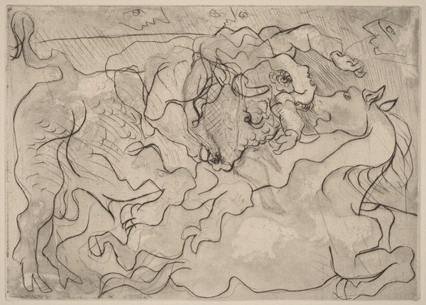 Editor: We're looking at "Landscape Fantasy, with Cactus and Setting Sun," a 1951 ink drawing by Tomás Joseph Harris. It's striking how the desert landscape is both familiar and otherworldly, and the intricate linework almost vibrates. What do you see in this piece? Curator: The symbolism here is quite evocative. Notice the cactus, a resilient symbol of endurance and survival, juxtaposed against the setting sun. It's an image imbued with the duality of endings and beginnings, the desert holding both the harshness of existence and the promise of transformation. Do you sense that tension? Editor: Yes, definitely. The swirling lines in the sky feel almost turbulent, but the setting sun offers a point of calm. Is there a particular cultural context that informs Harris's use of these symbols? Curator: Harris was deeply involved with surrealism, and symbols drawn from the unconscious were central to that movement. The cactus might represent repressed desires, while the setting sun signals not just the close of a day, but the fading of old paradigms, hinting at psychic renewal, a letting go. What feelings does the serpent evoke for you, winding its way throughout the scene? Editor: I see the serpent both as something threatening, like temptation, and as a symbol of healing and transformation, similar to the sun setting to allow the dawn. Curator: Precisely. Harris plays with that ambiguity, weaving layers of meaning into what at first seems like a simple landscape. Its emotional weight has the power to linger and subtly reshape our perceptions of reality and imagination. Editor: This drawing has a richer visual vocabulary than I initially understood. Thanks for making me consider all the layers and possible stories. Curator: My pleasure. Remember, the image echoes in cultural memory. Our dialogue refines the experience of that reverberation.