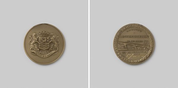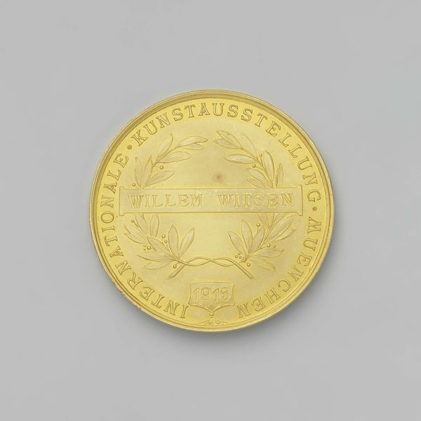 Curator: Standing here, we're observing a fascinating object. This is "To Cyrus W. Field from the American Chamber of Commerce, Liverpool, on the Laying of the Atlantic Cable, 1866," a gold medal created in 1866. Editor: It gleams with an almost audacious optimism, doesn’t it? It feels so solid, like the weight of human ingenuity made manifest. Curator: Absolutely. Think about the context. This wasn't just about art; it was about celebrating a massive feat of engineering, of communication across continents. Wyon’s piece highlights how metalworking becomes part of commemorative culture. It turns industrial achievement into an object of high status. Editor: You’re right. There’s a very specific narrative being crafted. See the detail—the laurel leaves suggesting triumph, the almost militaristic crest, the bold lettering… all emphasizing progress. But what does that progress truly signify, I wonder, for those on whose labor these industries thrive? Curator: It is interesting how the medal's physical production reflects social stratification of its day. Who benefits from such innovations and how does this medal communicate it? That information becomes physically concentrated into this object. And the presentation of such an object – who does it get presented to, where, how and why? It's all interconnected. Editor: All valid questions that this singular gold circle prompts, I think. You start contemplating the hands involved in making it and giving it…all that potential, crystallized here in a way. Almost a bit dizzying to consider. Curator: And also we get some insights to social structures and social status using precious metal such as gold in the artwork creation. Editor: Well, it has certainly given me plenty to reflect upon! A simple golden disc revealing so much more than one might think.