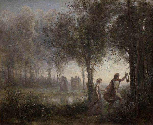 Editor: This is "Scene from Roman Life," painted by Henryk Siemiradzki in 1883, using oil paints. There's a beautiful, wistful feeling about it, almost like a memory. I'm drawn to the figure of the woman and the texture of the rocks, they're almost calling me in. What catches your eye about this painting? Curator: The material choices themselves are quite telling, aren't they? Oil paint allows for a luminosity, an almost theatrical light. Think about the cost of pigments in the 19th century and the kind of patron who would commission or purchase a work of this scale and detail. This isn’t just about depicting a Roman scene, it’s about projecting a certain status, a cultivated understanding of the past consumed for enjoyment. What do you see in the actual brushstrokes and the labor involved? Editor: I hadn't thought about it like that. There's an incredible amount of detail, especially in the clothing and the foliage. It seems meticulously rendered, which would have taken a significant amount of time and skill. Does that speak to the art world’s expectations back then? Curator: Precisely. Consider the pre-photographic era: such paintings fulfilled a desire for representational clarity alongside dramatic narratives. Think of the labour divisions: From grinding pigments, preparing the canvas to layering glazes. How might the social conditions surrounding Siemiradzki have shaped the painting’s romanticized depiction of Roman life? And, given its title "Scene from Roman Life," whose life is really being represented here? Editor: Right, because the average person in Roman times definitely wouldn’t have had this experience. It makes me wonder about who could afford to see themselves in this idyllic scene back then and, honestly, who can now. I suppose looking at it from a material perspective makes that privilege more stark. Curator: Indeed. By understanding the processes and materials involved, we reveal a complex intersection of class, taste, and historical narrative embedded within what initially appears to be a simple romantic painting. Editor: I see the painting in a completely different light now, no pun intended! Thanks for your perspective. Curator: Likewise. It’s by examining those embedded processes that we see beyond the surface, towards a more grounded understanding of art.