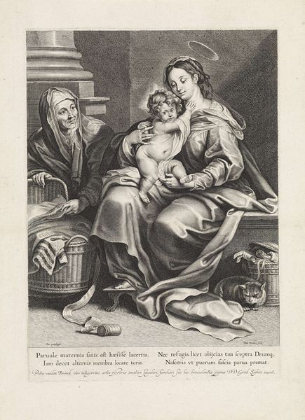 Diana Scultori created this print, *Virgin and Child with Saint John* in Rome around 1580. Dominating the foreground is the tender scene of the Virgin Mary cradling the infant Jesus, while Saint John kneels in reverence, holding a scroll marked with prophetic words. Consider the motif of the child saint, a symbol of innocence and divine foresight. This figure can be traced back to ancient Roman depictions of putti, winged child-figures, in both form and symbology. The putto embodies the spirit of love and guidance, echoing through centuries in art. The Virgin’s veiled head harkens back to classical images of veiled goddesses and matrons, figures that transcend the boundaries of religious meaning. This gesture, repeated through centuries, is laden with emotional and psychological weight. The cyclical nature of these symbols reveals that cultural memory doesn't progress in a linear fashion, but rather resurfaces, evolves, and takes on new meanings in different historical contexts.