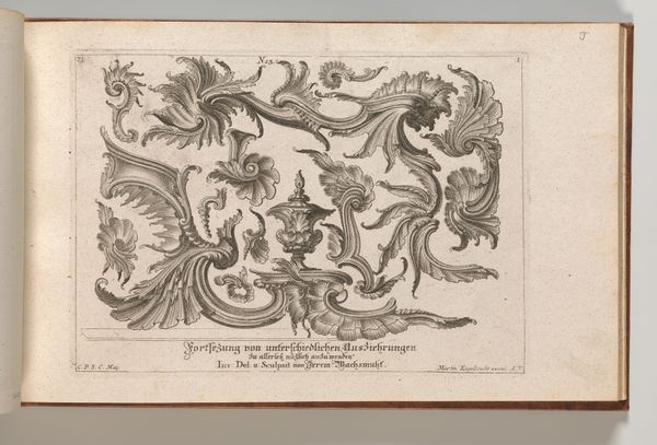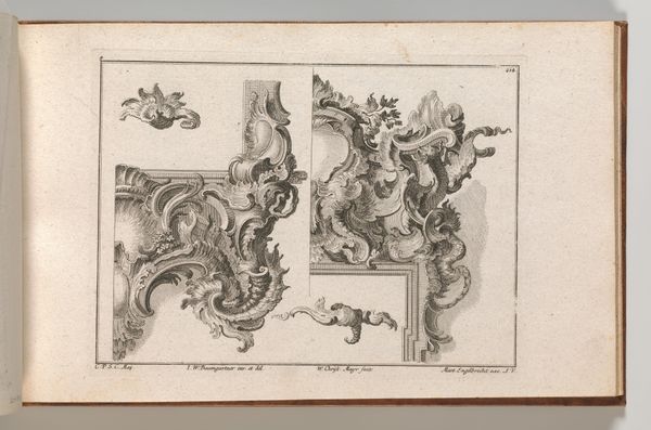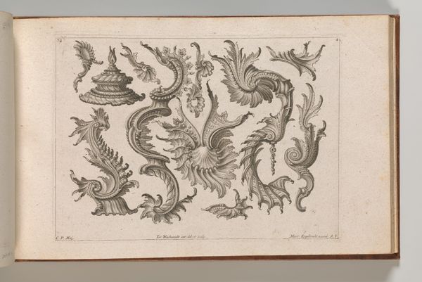Editor: Here we have "Various Designs for Rocaille Ornaments," an engraving from somewhere between 1745 and 1755 by Jeremias Wachsmuth. Looking at this densely ornamented composition, I can't help but think, "over the top," but in a delightful way! What do you make of this elaborate plate? Curator: Oh, isn't it glorious? To me, it’s like stumbling into a confectionery, all swirling sugar and architectural fantasies. This plate captures the spirit of the Rococo. Consider it as pure visual play— a rejection of the previous era's stricter lines for something altogether more exuberant. Do you notice the lack of symmetry? Editor: Absolutely! It's a controlled chaos of curves and flourishes, which gives it a whimsical energy. I can almost picture these motifs adorning the interiors of grand palaces. Curator: Precisely! And it wasn't just palaces. These designs were intended to inspire artisans creating everything from furniture to metalwork. Imagine taking one of these ideas and embellishing a simple object, suddenly transforming it into a work of art. This reflects an interest in democratizing luxury. It’s not only the rich who might live with beauty, but the rising middle classes, too. The Wachsmuth would have felt he was changing the world one curve at a time. Editor: I never considered the aspirational aspect of it. It really does reframe my initial interpretation from pure extravagance to something more…accessible and influential. I suppose that’s why this kind of decorative art lasted. Curator: Indeed! The Rococo, at its heart, celebrates beauty in the everyday. So look closely, find the wit, find the curve, and ask yourself, how might you re-design the world with Wachsmuth’s toolkit in your hands?