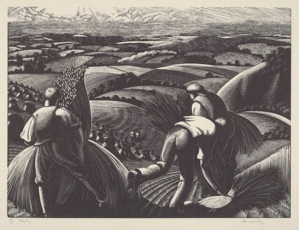 Curator: The immediate impression I get from Frank Cassara's "Wheat Harvest" is one of robust labor, a classical composition rendered in muted tones. Editor: Indeed. Executed as a lithograph around 1937-38, this print embodies the Regionalist movement’s focus on depicting rural American life. The materials—the lithographic stone and printing press—allowed for relatively widespread distribution, bringing scenes of agricultural work to a broader audience. Curator: Look at the figure with the raised arm; it's almost a directive, a subtle compositional choice that injects tension into the bucolic setting. The textures are compelling as well; how did he achieve this using lithography? Editor: It is remarkable, isn’t it? Through the labor-intensive process of drawing on stone, Cassara controls the density of marks. Each individual stalk of wheat and furrow of earth represents direct manipulation, highlighting the artist’s own labor echoing the harvest portrayed. Curator: I think you are right, it draws the viewer into an empathetic view with workers, in stark relief to many academic paintings of the time that glossed over real material realities. And beyond technique, I find it fascinating how he frames a sense of collective action within the picture, too. Each figure performs an indispensable task that culminates in the broader wheat harvest—their shared humanity in action. Editor: Right. He really captured the sense of community labor. We see individual laborers defined in relation to production, reflecting an interest in depicting labor that emerged as both subject and mode of making within American art and society in this period. The print itself functions, similarly to how Cassara’s workers labored collectively towards shared production—in its reproducible dissemination across society. Curator: A compelling reading—both an exploration into shared labor through harvesting but an argument of art for all in sharing a material form through a readily reproducible medium. Editor: Yes. This gives a far richer perspective to "Wheat Harvest" now. Thank you for offering those ideas, a way into which materiality reflects societal norms.