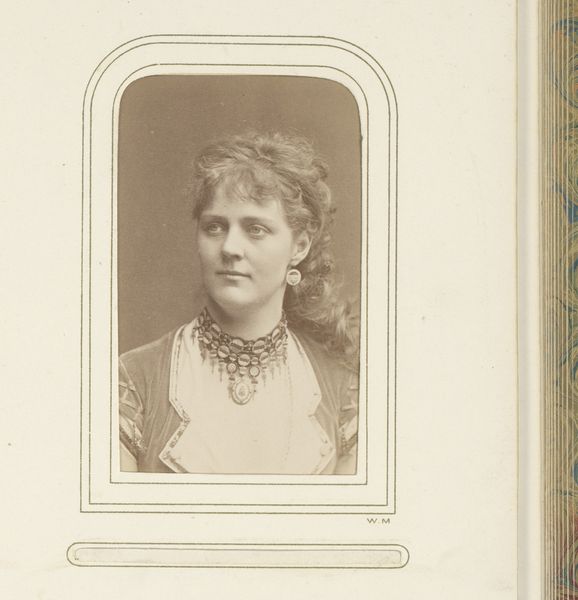 Editor: This is “Portret van een vrouw” by Johannes Baer, made sometime between 1873 and 1891. It’s a photographic portrait, and I find the whole presentation, the matting, the sepia tone, very evocative. How would you approach looking at this piece? Curator: I'm immediately drawn to the labor embedded in this photograph and the surrounding materials. It’s easy to overlook the intricate details, but consider the photographer's skill in manipulating light and chemicals to create this image. How does the photographer use specific printing processes, paper types, and developing techniques typical of pictorialism and how were those chosen or available? Editor: So, you’re saying that the way it's made tells us a lot about the photographer? Curator: Exactly. We have to think about the whole economy of portraiture at the time. Consider the social context: Who was able to afford a photograph like this? What was the relationship between the sitter and the photographer? Are they participating in creating genre painting, or documenting it? Were women photographers common during this period, and how did the dynamics of gender factor into artistic production? Editor: It's fascinating to consider how the simple act of taking a picture could reveal so much about labor and class! Curator: Absolutely, the materiality of the photograph is far more than just ink on paper, it's a product of technology and social systems! Furthermore, notice the framing – does it mimic a jewelry box, adding an aspect of ornamentation to this photo, commodifying the female figure within the portrait? How does that framing inform our perception of value and objectification here? Editor: I never would have noticed the frame looking like a jewelry box. That's fascinating. Curator: Right? Thinking about process helps uncover many different insights! Editor: This really sheds new light on the relationship between photography, society, and even economics. Curator: Indeed! By thinking critically about how something like this photograph was made and received, we gain new perspectives and appreciate how it acted as material within 19th century society.