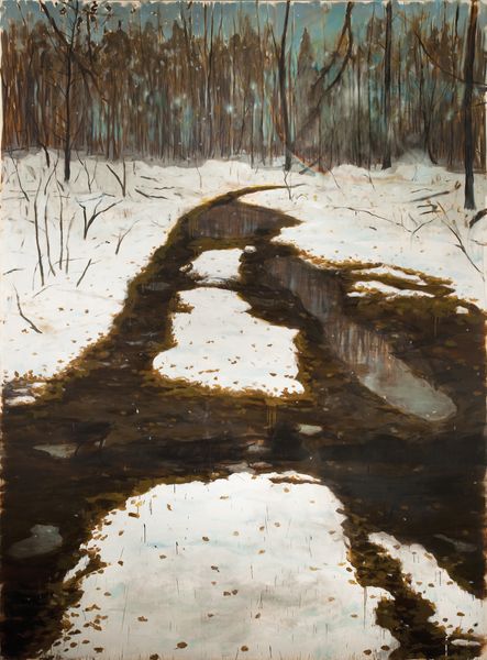 This is an image of ‘Parsifal I’ by Anselm Kiefer, and you can see how the texture of the wood dominates this piece. The deep browns and blacks create a somewhat oppressive atmosphere, lightened only slightly by the white cot and the window. Kiefer uses strong, linear elements in the architecture, which contrast with the soft, almost ethereal presence of the cot. The cot becomes a signifier, a symbol of potential or purity, set against the rough materiality of the wood. The structural form of the room, with its converging lines, draws the eye to the window, which acts as a vanishing point. Note how the artist seems to be engaging with themes of memory and history, using semiotic codes of space to explore the human condition. Kiefer’s composition, with its stark contrasts and textured surfaces, destabilizes any fixed meaning. The artwork remains open to interpretation, a space for ongoing dialogue.