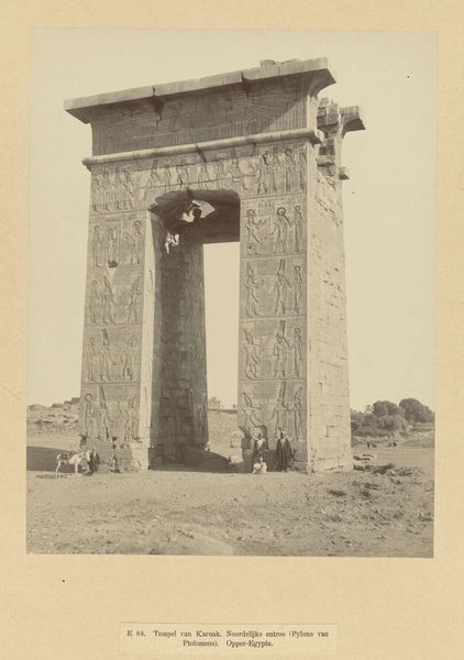 Curator: Here we have Francis Frith’s “Sculptured Gateway, Karnac,” a gelatin silver print taken in 1857. It resides here at the Art Institute of Chicago. Editor: Immediately, I’m struck by the sheer mass and weight of the gateway. You can practically feel the desert grit embedded in the stone. Curator: Absolutely. Frith, a master of early landscape photography, captured not only the scale but also the symbolic density. Look at the figures carved into the stone; they tell stories, record histories, and speak to beliefs about power and the divine. Editor: And what labor went into constructing something like this? Quarrying, transporting, carving—the social and economic organization behind it is just mind-boggling. It forces you to confront ancient systems of power. Curator: Precisely. Each carved figure holds a meaning—pharaohs, gods, offerings. Consider the orb above the gate: a classic symbol of the sun god Ra, representing creation and kingship. The gateway itself isn’t merely an entrance, it's a threshold to a sacred realm. Editor: These images have served so many purposes and masters. Initially charged with the state power of the Egyptian empire and its elite classes; subsequently repurposed into colonial trophies for Western audiences hungry for orientalist projections of power. It’s all encoded here. Curator: Frith was very intentional. His photographs catered to Western fascination with Egypt but he also brought back invaluable visual records, documenting sites like this one with scientific precision. It allows us to see a sliver of the past through his lens. Editor: It’s a powerful thing to ponder what these ruins signify now, juxtaposed against the forces that brought Frith, his camera, and his colonial project there in the first place. Curator: This photograph holds layers, then—layers of cultural meaning and historical implications captured in light and shadow. It still invites questions about what endures and what is lost. Editor: Yes, and how art always serves somebody—for better or worse. Food for thought in every weathered line.
