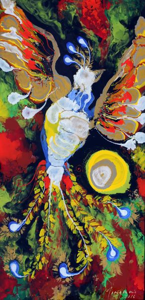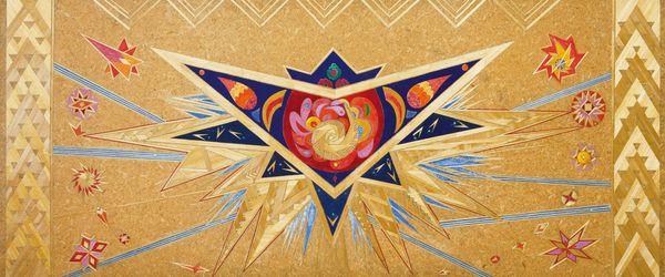 Curator: The sheer opulence hits you immediately, doesn’t it? The red and gold scream royalty, excess… This is “Samson and Delilah,” by Erte, an Art Deco master. It’s an acrylic painting. Editor: Yes, royalty alright! And I can practically feel the cold weight of those chains; the contrast is arresting, visually and…materially! Look how spare that medium wash is in comparison with that brute-like muscle. It's masterful in the sense of crafting that tension and a balance between two unequal powers. Curator: Absolutely. Beyond the tension, it speaks volumes about gender dynamics and cultural narratives. Consider Samson, the once mighty hero now reduced, quite literally, to his knees. This pose evokes exhaustion, even despair. Editor: While Delilah appears doll-like, seemingly weightless… the contrast really brings up interesting notions about visibility and the cost of luxury: the gold leaf practically drips from the page. Consider also those delicate layers on Delilah and the contrast between that, and those lines that denote Samson's muscle: it feels so controlled and clean. What story about artistic intention and making does that tell? Curator: Fascinating point about the application. Notice Delilah’s gaze – completely unfazed. Erte plays with a well-worn trope of the femme fatale, right? This icy, unattainable woman, her beauty as a weapon against male strength. I believe the geometric pattern of her garments mirrors her strategic thinking. It's all calculated. Editor: Exactly! While she is coded into delicacy via color, pattern, and gesture, she nevertheless holds two chains. And there's something incredibly compelling in the clean lines and the high key colors that seems to almost flatten this tableau. In some ways, all we see here is artifice; that every gesture toward either the beautiful and treacherous Delilah, or a mighty-turned-humble Samson, all we see here is production itself. Curator: A striking observation on the artificiality. Ultimately, I see in this artwork a potent reminder of how enduring stories shape our understanding of power and vulnerability, trickery, and consequence. Editor: Yes, while I would add to that that such lessons are literally laid out with such flat, unyielding lines that it's a great work to consider regarding the processes that lie between craft and storytelling.