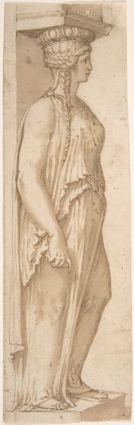 Editor: Here we have a drawing of a standing female figure by Parmigianino. It looks like it’s rendered in charcoal, chalk, and maybe some ink. The figure’s draped in fabric, holding a vessel on her head… almost like she’s defying gravity. There’s a grace and vulnerability to her pose. What catches your eye? Curator: The first thing that leaps out at me is the elegance – almost an exaggerated elongation – characteristic of Parmigianino's style. This drawing, I imagine, captures him wrestling with line and form, doesn't it? The very nature of charcoal and chalk – their inherent ephemerality – feels right for this subject. Does it evoke a fleeting moment, like a half-remembered dream, for you? Editor: It does. Especially with the unfinished quality, it feels like a memory taking shape. Why do you think he chose such soft, forgiving mediums? Curator: I believe he’s searching. Searching for the perfect line, the perfect gesture, to convey the ideal of feminine beauty that he sees in his mind's eye. The softness also allows him to play with light and shadow, creating a sense of volume without being overly defined. It’s less about rigid representation, more about…feeling. Editor: So, it's less about accuracy and more about capturing the essence? Curator: Exactly. This work exists in the realm of suggestion and atmosphere, drawing us into the artist's intimate process. How remarkable to witness a Renaissance master seemingly caught in a moment of pure artistic intuition. It gives us permission to abandon precision and simply feel our way through the beauty. Don’t you think? Editor: That’s lovely. I’ll definitely look at it differently now. Thanks! Curator: My pleasure! Now, about that vessel on her head…I have a few thoughts...