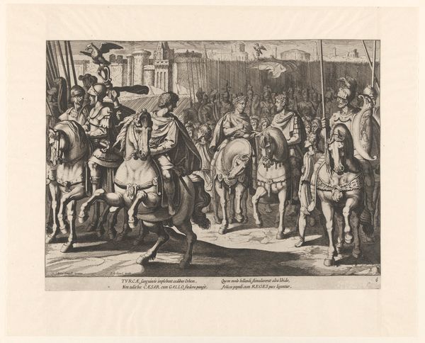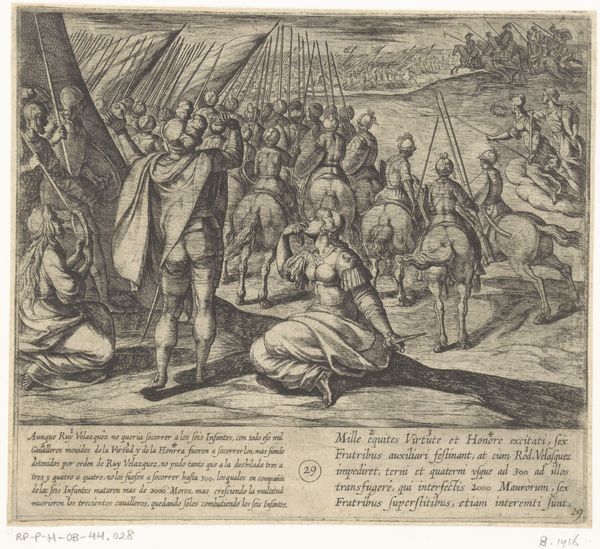 Antonio Tempesta created this engraving, "Illustratie bij Canto VIII van Tasso's 'Gerusalemme Liberata'," sometime between 1555 and 1630. The composition, teeming with figures, immediately strikes you with its dynamic energy. Linear precision and meticulous detail define the forms, from the soldiers' armour to the tents in the background. Tempesta’s technique employs a sophisticated hatching system, creating tonal variation and adding depth to the scene. The engraving illustrates a pivotal moment from Tasso’s epic poem, where the character Latino mourns Rinaldo's supposed death. Tempesta uses formal elements to heighten the drama. The gesticulating figures create a visual language of grief and conflict. The sharp lines and stark contrasts evoke a sense of turmoil and emotional intensity, consistent with the Baroque aesthetic of the period. Consider how the formal choices—the density of lines, the distribution of figures, the use of light and shadow—all contribute to the narrative’s emotional and thematic depth. This engraving is not merely an illustration but a sophisticated engagement with the poem’s themes of heroism, loss, and deception.