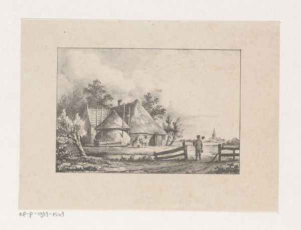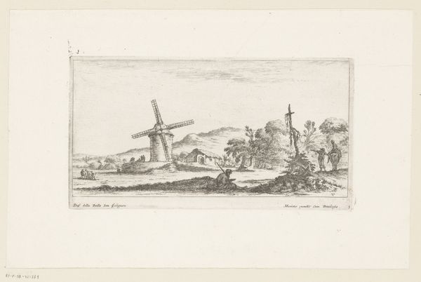 Editor: Here we have Eugène François de Block's "Landscape with Mill" from 1840, done in ink on paper. It’s a beautifully delicate drawing; the texture feels very rustic and calm. What draws your eye in this piece? Curator: Immediately, the windmill strikes me, not just as a functional structure, but as an emblem. Think about what the windmill symbolized historically – ingenuity, progress, and humankind's interaction with nature. It also represents a shared connection, it represents a cultural touchstone that roots us. How do you see the people depicted, and their relationship to this central emblem? Editor: I see them almost as figures frozen in time, like they are a vignette to accompany the iconic windmill, or vice versa. They definitely reinforce the scene's overall tranquil feeling. But I'm curious, is it typical to have human figures featured so prominently within landscapes from this period? Curator: Good question. Genre painting, which this also represents, was gaining popularity. So you get an intersection of everyday life being subtly infused within these grander, pre-established ideals about landscape. Consider how that impacts our understanding today - are we merely looking at an antiquated structure of mill, or something still alive? Editor: That makes sense, I guess without the figures it’s only the image of a mill! Considering the integration with those subtle human forms adds meaning to an otherwise potentially stale relic. Curator: Precisely! And that layering of meaning is what gives artwork a staying power, even centuries later. It enables it to shift into memory, both for culture and our own individual memory. Editor: That's so interesting. I’ll definitely view landscapes differently now.