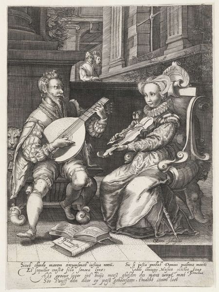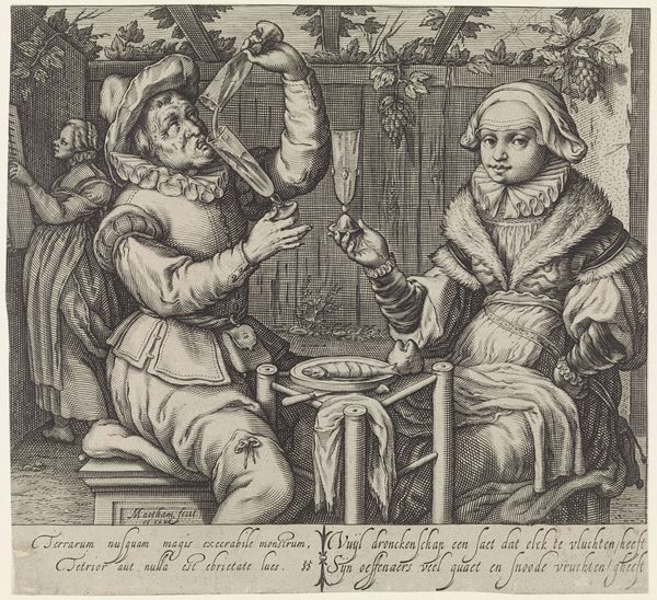 This engraving, "Liefdespaar en de Dood," presents a scene of earthly delight juxtaposed with the stark reality of mortality. An anonymous artist crafted this work, employing fine lines to create depth and texture within a small-scale format. The composition is structured around contrasts: the dark, skeletal figure of Death looming over a couple enjoying music and leisure. Note how the artist uses contrasting textures – the smooth skin of the living versus the coarse rendering of Death – to amplify the visual impact. The skull’s gaze pierces through the scene, disrupting the harmony of music and ripe fruit, destabilizing our easy enjoyment of sensual pleasures. The structured arrangement of these elements invites us to contemplate the transience of life. The artist employs a semiotic language where musical instruments and food symbolize temporary indulgence, while the hourglass and skull serve as potent reminders of time’s passage and inevitable decay. It's a visual metaphor that challenges fixed notions of beauty and happiness.