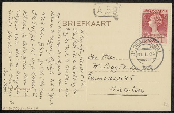 Richard Nicolaüs Roland Holst made this postcard to Willem Bogtman around 1911, likely using readily available postal materials. Looking at this postcard, we can consider the place of such ephemeral objects in the broader art world. In the early 20th century, the Netherlands was undergoing significant social and political changes, including the rise of socialism and a growing interest in national identity. Here, the presence of the stamp is interesting. It commemorates the reign of Queen Wilhelmina, but it also suggests how even everyday items participate in the construction of national symbols. What might appear banal is actually a potent reminder of the power of institutions in shaping our sense of self. To understand such documents fully, the historian must combine visual analysis with archival research to understand the social context of artistic production. Art always relies on the moment in which it was made.