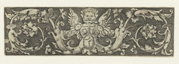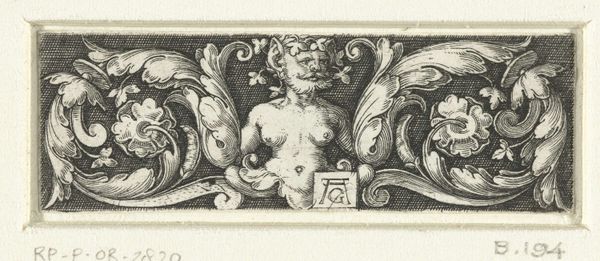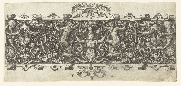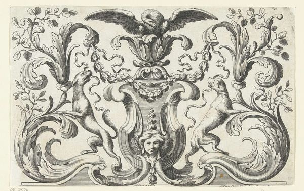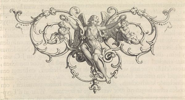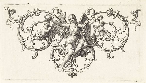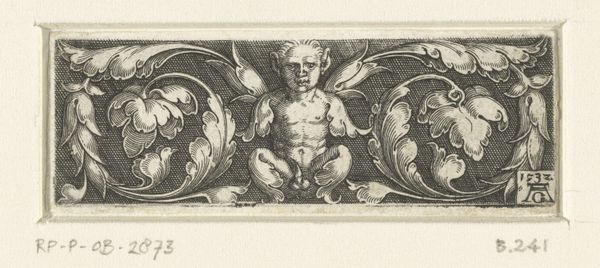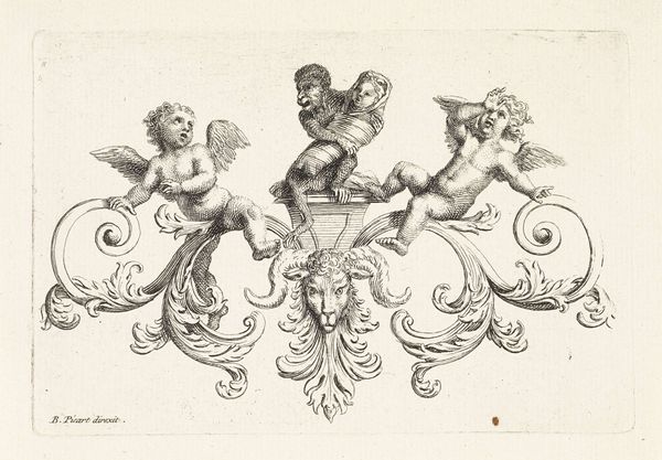 Editor: This engraving, “Horizontal Cartouche with Seated Child,” dates from between 1657 and 1685. It’s anonymous, currently housed in the Rijksmuseum, and the cartouche element framing the child gives it a decidedly Baroque flair, though a grotesque one. How should we interpret the presentation of the winged child and these…almost sinister architectural elements? Curator: The ‘sinister’ elements, as you put it, were quite popular. Cartouches of this type served a public function as decorative framing for important information – think proclamations, maps, official announcements. In this context, ask yourself, what statement is made when these elements frame an infantile nude figure? Editor: Well, on one level, the juxtaposition feels jarring. Official announcements versus the body. There's also the tradition of the nude in representing authority… Perhaps the image toys with these tropes, elevating childhood… or corrupting it? Curator: Exactly. The power dynamic shifts when you view it in this light. Baroque art, while seemingly religious or decorative, frequently critiqued social mores or even served as veiled political commentary. It's important to remember the period's emphasis on decorum versus the display here of an innocent, infantile body. What readings does this tension potentially unlock? Editor: It highlights potential societal anxieties, maybe the loss of innocence, and questions about power and authority during this time. And it reflects how the art world of that era grappled with cultural norms and expectations. I hadn't really considered this interplay. Curator: The institutional display and our understanding of these prints contribute further layers of interpretation even now, shaping what we deem aesthetically important. Editor: Absolutely. Thanks! It gives me a new perspective on how historical context influences art, its production and even its meaning for viewers.