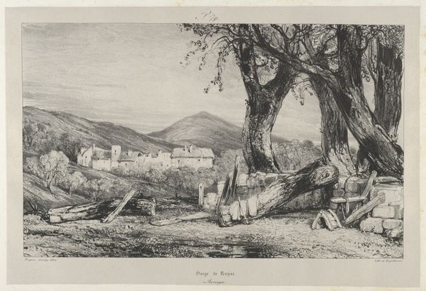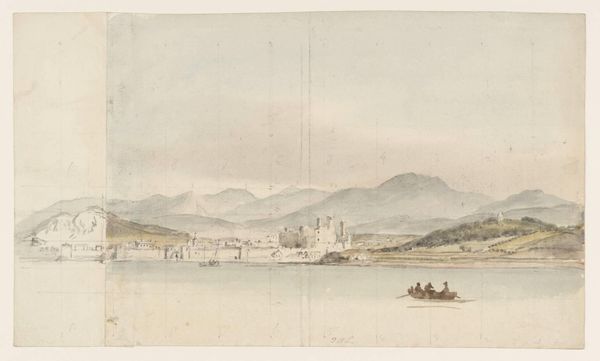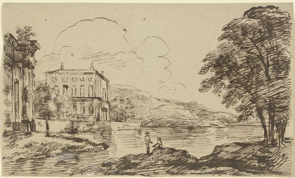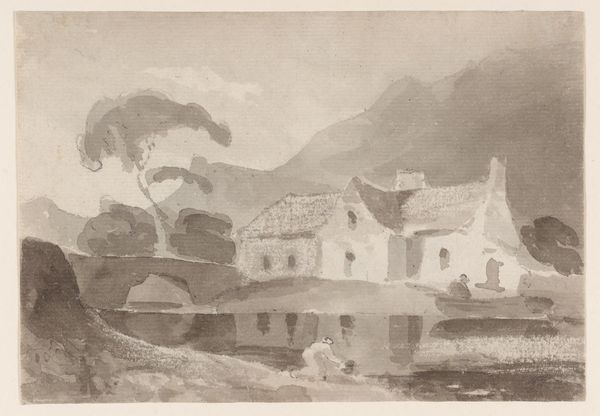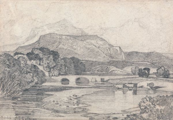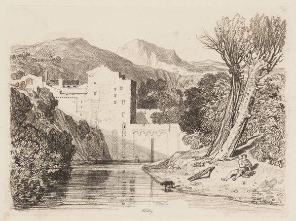 Curator: Oh, it has that wistful, windswept feel doesn't it? It’s amazing what can be conveyed with pencil on paper, but what catches your eye first about this landscape? Editor: Definitely the architecture. Look at that imposing structure perched on the bank, it gives the whole scene a sense of history, of resilience. I find myself thinking about power structures, the echoes of land ownership in these kinds of landscapes. Curator: That makes sense! And here we have "Near Whitby, Yorkshire" created in 1814 by John Sell Cotman. Pencil, it says in the description. It feels both incredibly detailed and dreamlike at the same time. Do you ever wonder what the artist was feeling, sketching by that river? I picture someone quietly observing, a soul a little separate from the world around. Editor: Absolutely. There is a very strong tension here between human presence and the sublime indifference of nature, wouldn’t you agree? Romanticism grappled with this a lot. Look at the lone figure relaxing by the tree...almost surrendering to the landscape. Is it a commentary on social alienation? On industrialisation's disruption of rural life? Curator: Perhaps, but I’m also sensing that almost defiant romantic individualism we always talk about, the artist asserting his unique perspective of nature. Those mountains looming in the distance, they whisper tales of ancient, untouchable beauty, don't they? I imagine Cotman, in that moment, transcending the social noise to grasp something more profound. I find that so alluring in landscape art! Editor: I’m less inclined to remove art from broader cultural forces. If anything, this scene shows the complex dialogue of an artist negotiating both internal emotional terrain with social anxieties. That figure might just be having a nice rest! But the simple act of choosing what, and how, to represent…there is always a position embedded within that choice. Curator: True! And how delightful is it that this humble pencil drawing gives way to so many narratives! Editor: Exactly, a quiet sketch harboring entire worlds, for all of us.