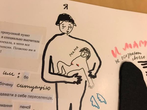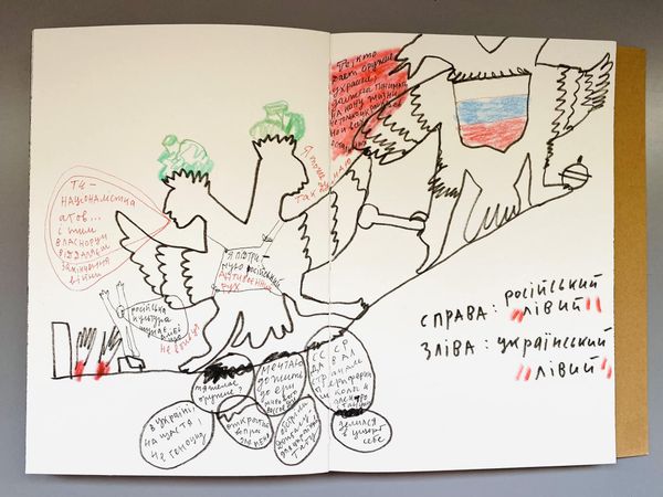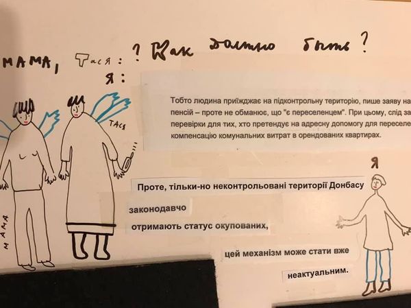 Editor: This drawing from 2019, "Untitled. Strawberry Andreevna" by Alevtyna Kakhidze, is created with ink on paper. It feels like a page torn from a personal journal, filled with fragmented narratives and figures. What do you see in this piece that might offer insight into its context and meaning? Curator: This work powerfully captures the socio-political realities impacting ordinary people, specifically within the context of displacement and pension access in Ukraine. Notice how the artist uses the visual language of comics and personal sketchbooks to convey complex bureaucratic issues. How do you see the personal and the political intertwining here? Editor: The way the artist combines these cartoonish figures with text makes it seem very direct. I almost feel like I'm eavesdropping on a conversation. Curator: Precisely. The juxtaposition of the informal, diaristic style with the gravity of the subject matter—pensions being withheld, the plight of displaced persons forced to feign resettlement—creates a poignant tension. What public role do you think artwork like this accomplishes? Editor: Perhaps it spotlights issues that might be overlooked or obscured by more official accounts? It definitely feels like a very human story. Curator: Exactly. It transforms individual experiences into a collective reflection on the systems that govern, and sometimes fail, vulnerable populations. This highlights the crucial role art can play in bearing witness and prompting critical engagement with the politics of everyday life. Editor: I see now how the apparent simplicity of the drawing style belies its profound commentary on social justice. Thank you for elucidating the relationship between the art, the artist, and broader sociopolitical factors! Curator: My pleasure. It’s in connecting the visual and the contextual that art truly speaks to us.