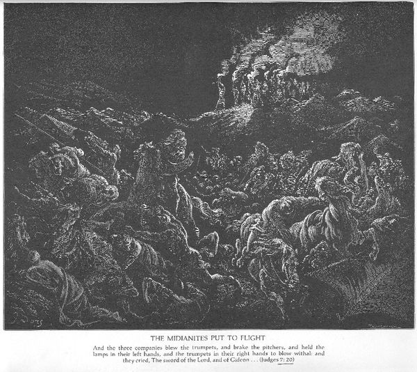 Curator: Dore’s “Gideon Chooses 300 Soldiers” – a flurry of ink and engraving – feels to me like a dream half-remembered, a fable flickering on the edge of sleep. It's like looking into a storm cloud, searching for shapes and meaning within its turbulent depths. Editor: It's interesting you describe it that way. Dore is known for narrative pieces. What stands out to you in this one? Curator: What grips me is that landscape. Dore wasn't just illustrating a scene; he was conjuring a world, thick with atmosphere and mood. Look at those horizontal lines in the sky – the landscape looks less like it has form, and more like it is being shaped like waves as in a sea, by some omnipotent, divine gesture. Have you considered how much this scene seems set on the brink of revelation? What feelings does that evoke in you? Editor: It is kind of unsettling to observe so many people ready for battle as in the blink of any eye God would make up His mind... It is also wild how those chosen few, lapping like dogs, that this image alludes to, becomes an allegory for something! The fact is Dore captures it all. And all so poetically! Curator: Yes! To me, the real genius lies in how Dore takes this quite literal biblical scene, then transforms it. He invites you to consider ideas bigger than the battle – questioning leadership, dedication. It feels less like a history lesson and more like a timeless meditation, wouldn't you agree? Editor: Absolutely. The details almost dissolve into symbolism – this almost feels as though the viewer needs to be involved as well and make sense of the many metaphors. Thanks; this piece made me really think. Curator: It has been a pleasure to me as well to try to bring forth its metaphors.