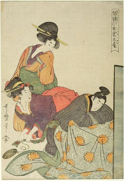 Curator: This 18th-century woodblock print, "Seven Gods of Good Fortune and Otafuku celebrating New Year's," by Kitagawa Utamaro, shows a lively scene. What strikes you first? Editor: The depiction of labor, the butchering of the fish, the serving of food—it feels very grounded and human. How can we understand this portrayal in its cultural context? Curator: This domesticity reflects the changing social dynamics of the Edo period. Utamaro challenges the traditional depictions of idealized beauty by including elements of the working class and a figure from folk religion. What does that imply about the intended audience? Editor: It suggests a broader audience, maybe outside the aristocracy, which is a significant shift. Curator: Exactly. Utamaro’s work becomes a window into the lives of everyday people, elevating their experiences. It makes me wonder, does it challenge or reinforce existing social hierarchies? Editor: That’s a perspective shift for me. Thanks! Curator: Consider how the act of depicting the working class can both celebrate and possibly exoticize them. Art creates its own reality.