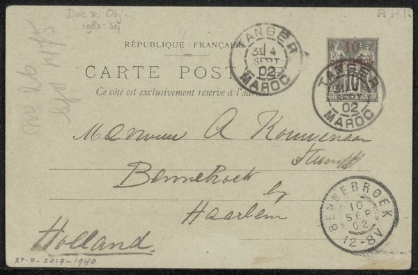 Editor: This is a postcard, a 'Briefkaart aan Philip Zilcken', dating between 1887 and 1941, crafted by Lya Berger using pen and ink on paper. What strikes me is the elegant cursive script; the very strokes of the pen create a delicate visual texture. How would you approach interpreting this piece? Curator: Considering its formal aspects, note how the handwritten text isn't simply informational; it becomes a dominant design element. Observe the interplay of the crisp, dark calligraphic strokes against the muted paper tone. The ascending and descending lines form dynamic diagonals across the card's surface, almost like musical notation. Editor: So, you're suggesting the act of writing transcends its utilitarian purpose here? Curator: Precisely. Focus on how the varying line weights – thicks and thins – and the subtle curves introduce visual rhythm and hierarchy. Note the deliberate placement of the postage stamps, they serve almost as punctuated points enhancing the overall composition. Ask yourself: how do these elements contribute to the overall aesthetic experience? Editor: It’s less about what it says, and more about how it looks saying it? Curator: In part. The beauty here lies in the execution, in the masterful control of the pen and the deliberate arrangement of visual elements within a defined space. This turns something mundane, a simple postcard, into an expressive artifact. Editor: I now understand the significance of focusing on form, line, and materiality rather than diving straight into content, even when, as here, that content is literally handwriting. Thank you! Curator: A trained eye understands the power of subtle visual cues to engage the viewer's aesthetic sensibility.