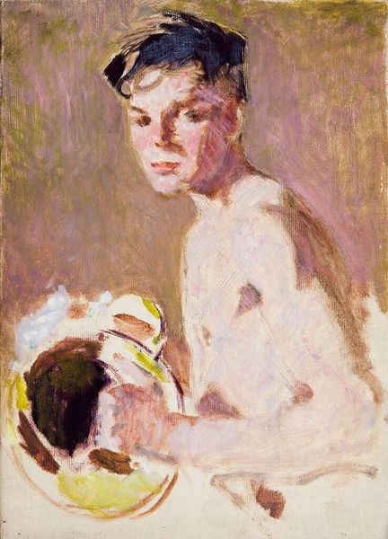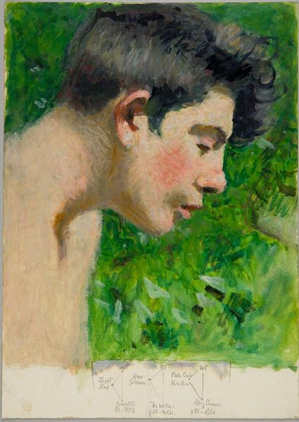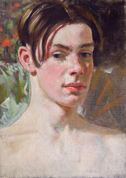Editor: This is Denman Waldo Ross’s "Portrait of a Young Man with Figures Behind Him," and I’m struck by the dreamy, almost ethereal quality. What do you see in this piece? Curator: Oh, it's like a half-remembered summer afternoon, isn't it? The loose brushstrokes give it that hazy, nostalgic feel. I see a gentle exploration of light and form, but there's also this undercurrent of introspection. Are those figures cavorting in the background just figments, or memories intruding? Editor: That's interesting, I hadn't thought about them being symbolic. Curator: Maybe they are, maybe they aren’t! Art is that space where reality and imagination dance. I think this portrait is all about capturing a fleeting moment. Editor: So, the magic's in the ambiguity. Thanks! Curator: Exactly! It leaves you with more questions than answers, which is sometimes the best kind of art, isn't it?