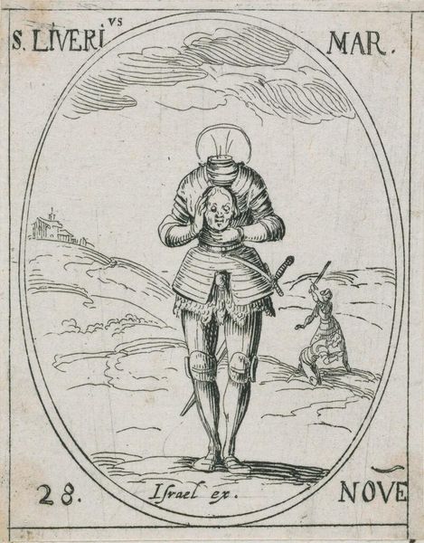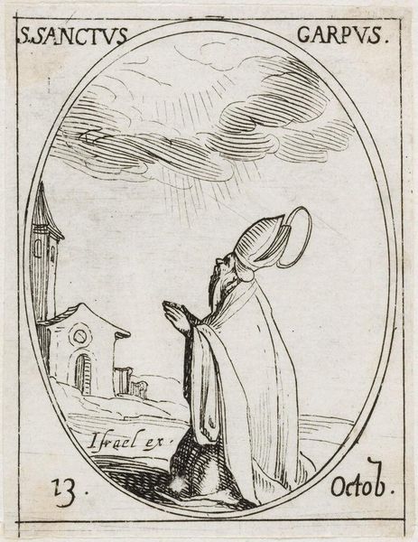 Curator: Looking at this etching, Saint Paula, created by Jacques Callot, I'm struck by the journey it seems to depict. There's a real sense of pilgrimage. Editor: Yes, I immediately felt a sense of determined movement. The figures, particularly Saint Paula with her staff, are rendered with an economy of line that suggests resilience in the face of hardship. I wonder about the power dynamics at play here, the adult and child, rendered similarly but perhaps not equals. Curator: Callot was a master printmaker in the early 17th century, known for his incredible detail. Paula was a Roman widow, who followed Saint Jerome to the Holy Land and founded several convents. The image itself, though small, speaks to themes of devotion and female agency in religious history. Editor: Indeed, situating Paula within a framework of early Christian feminism, one can see how her journey challenges the patriarchal structures of the time. Her devotion becomes a form of resistance, a way to carve out space for female spiritual leadership. The choice to depict her with a child further complicates the narrative, raising questions of motherhood and legacy. Curator: Absolutely. Considering the role of religious imagery in shaping perceptions, Callot's portrayal likely influenced how Saint Paula was viewed and remembered. Editor: Ultimately, it's a testament to the power of art to illuminate historical figures and their contributions to our collective understanding of faith, gender, and social change. Curator: A wonderful intersection of faith and action.