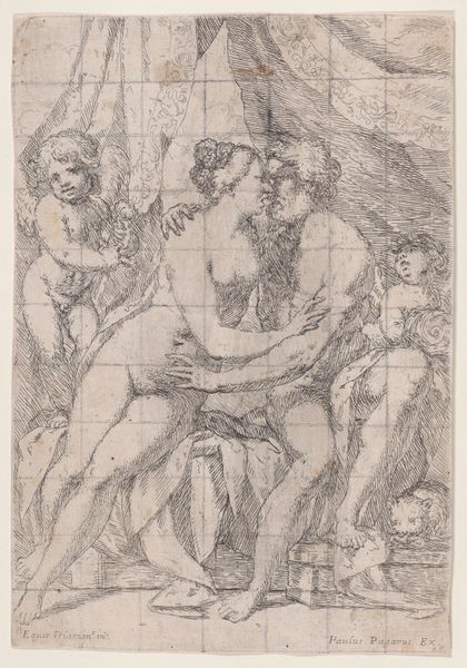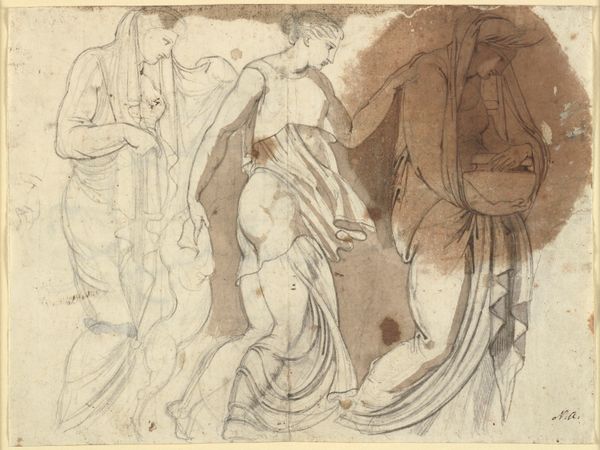Editor: Here we have "Diana and Callisto," an undated drawing and print on paper by Adriaen van der Werff. There's a somber mood hanging over the scene. What historical context might shape our understanding of this piece? Curator: This drawing depicts a pivotal moment of discovery and subsequent punishment in the Ovidian tale. Diana, goddess of the hunt and chastity, exposes Callisto's pregnancy, a violation of her vow. To truly grasp this image, we must acknowledge the power dynamics at play. How does Van der Werff visually represent Diana's authority, and what does it tell us about 17th-century societal expectations regarding female virtue and obedience? Editor: It's interesting; Diana's pointing finger does carry a strong accusatory energy. Are the other women in the scene complicit? Curator: Precisely! The nymphs surrounding Callisto seem to both recoil and stare, embodying the social policing of women’s bodies and sexuality. Consider how this scene might resonate with contemporary discussions around victim-blaming and the policing of female reproductive rights. The artistic focus isn’t merely on mythological figures; it invites commentary on how transgression is handled within a community and by figures of authority. Do you feel any sense of vulnerability emanating from Callisto’s posture? Editor: Definitely. She looks ashamed and unsupported. This really adds layers to the image, far beyond a simple mythological narrative. Curator: Indeed. Van der Werff gives us an opportunity to analyze not just the story itself but the continuing echoes of power, gender, and societal control within it. Perhaps considering art history through an intersectional lens gives us not only new appreciation of such works, but gives us vital language to address modern day issues of female control and authority. Editor: This conversation really opened my eyes! Looking at it with a perspective on female roles and societal expectations makes the scene far more poignant and relevant. Curator: Agreed. It shows how art from the past can speak directly to issues of today.