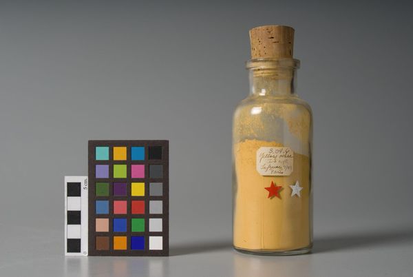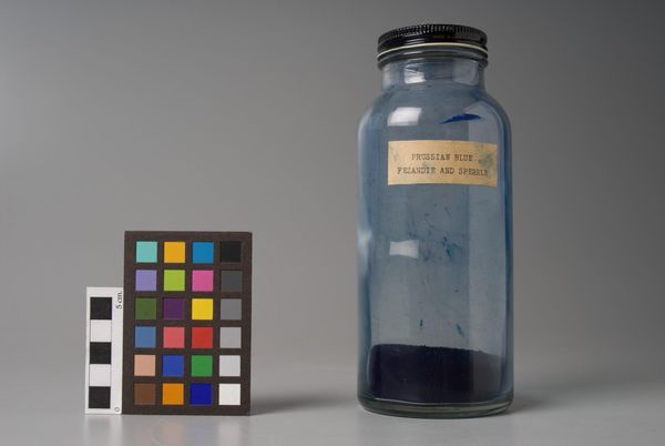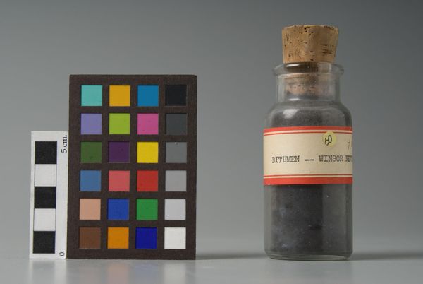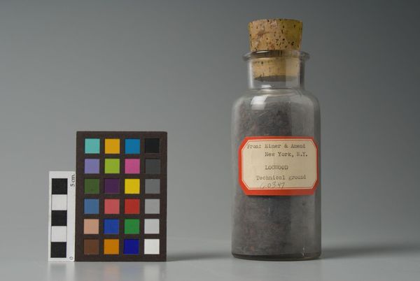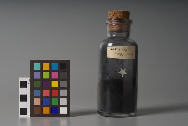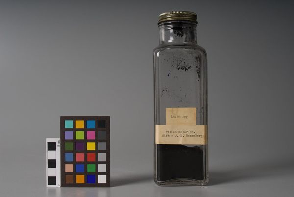 Editor: This is "Noir Ivoire? extra," made by Le Franc. It's an interesting juxtaposition of the stark black pigment against the clear glass. What strikes you about the composition? Curator: The object presents a study in contrasts. The chromatic intensity of the pigment is set against the transparency of the glass. Note the textured label, a small rectangle affixed asymmetrically, which introduces a further planar element. Editor: So, the label adds to the geometry of the artwork? Curator: Precisely. It disrupts the expected cylindrical form and invites closer inspection of surface and inscription. One might consider the relationship between container and contained. Editor: I never thought of it that way. Thank you.