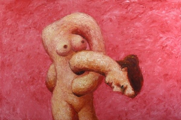Curator: Standing before us, we have Alexander Roitburd's "The Parting of Hector and Andromache #3," created in 2010 using oil paint and acrylic on canvas. Editor: My first reaction is one of visceral unease. The distortion and starkness in the figure is quite…unsettling, yet compelling in its raw vulnerability. Curator: Indeed. The choice to invoke Hector and Andromache, figures deeply embedded in the historical narratives of love, war, and loss, is fascinating. How do you feel the art engages with socio-political themes? Editor: I'm seeing a subversion of classical ideals. The bodies, fragmented and grotesque, are devoid of heroic grandeur, stripping the narrative of its conventional political purpose. It prompts us to consider the human cost of war. Curator: I am also struck by the handling of materials. There seems to be heavy impasto, and bold brushstrokes are quite visible. How do you interpret that? Editor: It amplifies the expressionistic nature, creating a tension that mirrors the inner turmoil. Roitburd is not interested in portraying beauty, or even realism; he prioritizes conveying raw emotional states through his chosen medium. This rejection could align it to the legacy of Neo-Expressionism. Curator: Roitburd's status as an artist who navigated shifting political landscapes in Ukraine definitely shaped his lens. One wonders about his views on power and how that finds a visual place here? Editor: The image is about making us, the audience, participants in the disrobing, or should I say, decoding, of authority. I think Roitburd has crafted a narrative not just about mythological lovers but also the breakdown of societal narratives. Curator: So, a potent blend of personal struggle and larger historical contexts then. It highlights the lasting role that imagery has to challenge political ideas. Editor: And the making becomes another layer of interpretation – a Neo-expressionist revolt against complacency. Fascinating to ponder!