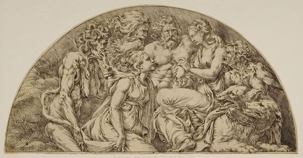 Curator: This delicate print, rendered in the old engraving style, comes to us from Heinrich Aldegrever in 1539. The Rijksmuseum aptly titles it “Frieze with a Bust, Foliage and Two Children." I see it as a charming vignette, full of unexpected combinations. Editor: It’s lovely, there's almost an ancient, slightly irreverent feel. But are they really children or are they plump cherubs? It is not easy to discern their true nature from the image. They seem plucked straight from a fever dream—playing amidst stern portraits and lush, drooping flora. Curator: It's Northern Renaissance decorative art at its finest! Prints like these weren't just decoration; they served as models for artisans. Think metalworkers, furniture makers—whoever needed fresh design ideas. This composition, figuration tangled in foliage, would give them something classical yet playfully original to work with. Editor: Ah, that explains the odd juxtaposition! So, imagine a serious craftsman trying to reproduce these mischievous cherubs, these chubby, grappling cherubs for... say a goblet? Do we know for whom the craftsman designed his art? For the Church, for a monarch, or just to serve the needs of their own creative process? Curator: We can only speculate but such decorations during the renaissance found wide applications: books, tapestries, building ornamentations for an aristocratic, educated public—all reflecting a culture of increased aestheticism. What’s captivating is how Aldegrever blends sobriety, with that serious-looking bust in the center, with such frivolous joy. Editor: You are correct; that tension holds my attention! It is as if the artist wants to convey an eternal truth through light touches, but there remains a certain weight nonetheless. It gives me a bit of hope—art surviving with hints and mysteries—which seems right. Curator: Absolutely! That sense of survival, and translation, resonates deeply. A quiet commentary on cultural resilience. Editor: I'll carry this little burst of contained joy with me. Thanks for unraveling a little of its enigma!