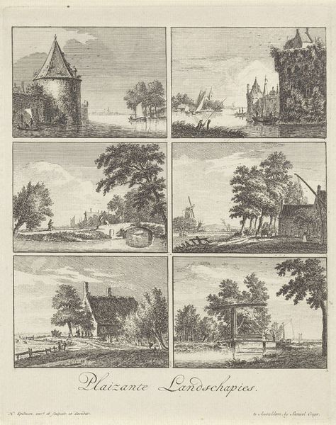 This print, "Gezichten op de Zomervaart en het Penningsveer bij Haarlem," was made by Cornelis van Noorde in the 18th century, using engraving, a printmaking technique where lines are incised into a metal plate to hold ink. The material qualities of an engraving – its sharp precision and reproducibility – lent themselves well to the depiction of Dutch landscapes. The intricate lines capture the textures of the rural scenes, from the thatched roofs of the farmhouses to the sails of the windmills. Each line is the result of manual labor. The artisan's hand skillfully guides the engraving tool to create an image that speaks to the rhythms of agrarian life, but also the new possibilities of industrial production. Windmills, such as those depicted here, were essential to the Dutch economy, used for milling grain, sawing wood, and draining water, and are essential to the labor required to maintain the Dutch landscape. By focusing on the materials and labor involved in both the making of the print and the scenes it depicts, we can gain a richer understanding of its cultural significance, blurring the lines between art, craft, and industry.