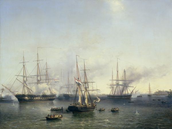 Ivan Konstantinovich Aivazovsky painted 'The Landing at Subashi' using oil on canvas. The painting is dominated by the striking verticality of the ships' masts, piercing the expanse of the sky, against the horizontal layout of the sea and land. The composition creates a structured interplay between natural elements and human endeavor. Aivazovsky's use of light and color evokes a sense of spectacle, yet the subdued palette and the muted brushstrokes invite contemplation. Semiotically, the ships symbolize power and exploration, and the overall structure conveys a narrative of ambition and interaction between man and nature. Yet, the lack of defined detail in the distant land suggests that it is a symbolic setting rather than an actual place. Ultimately, the formal arrangement of vertical and horizontal elements creates a balanced tension, reflecting the interplay between humanity's drive to dominate and the humbling grandeur of nature. The artwork invites us to examine the codes through which we perceive historical events and how artists visually negotiate such complex themes.