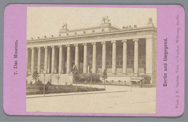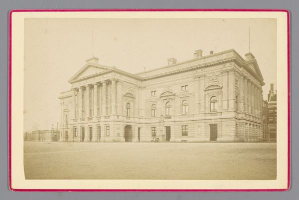 Editor: This daguerreotype print from the late 1860s shows the exterior of the Bourse de Paris. The classical architecture with the monumental columns dominates the photograph. There is this feeling of both permanence and the passage of time as seen in the city life bustling around. What jumps out at you when you look at this? Curator: The columns resonate with a deep cultural memory, don't they? Beyond architectural style, Neoclassicism served as a visual language of power, recalling the stability and order of the Roman Empire during a time of considerable political unrest. This image, for me, embodies that very tension. How do you think this visual reference was intended to be read? Editor: That’s a really interesting point. I hadn't considered the political implications so directly. So, are you suggesting the Bourse used this architectural style to project authority, even during periods of instability? Curator: Precisely! It's projecting confidence, creating a visual narrative around economic activity. Even details like the lack of vibrant color – inherent in early photography – contributes, adding an aura of solemnity, imbuing the mundane with weighty significance. It subtly invites you to perceive this place as more than a simple marketplace. Now, notice the people. How does their presence contrast with the monumental architecture? Editor: They almost seem dwarfed by it, reinforcing this idea of the Bourse as this grand, almost untouchable institution. The presence of horses adds to that classical feel, as well. I see what you mean. It’s a photograph, but it communicates much more than just the image of a building. Curator: Indeed. Images act as powerful carriers of cultural narratives, intentionally or unintentionally. And each element - be it the architectural style, or the arrangement of people - plays a crucial role in reinforcing the overarching message. Editor: Thanks, I’ll definitely think of images as loaded with symbols when I see architecture going forward.