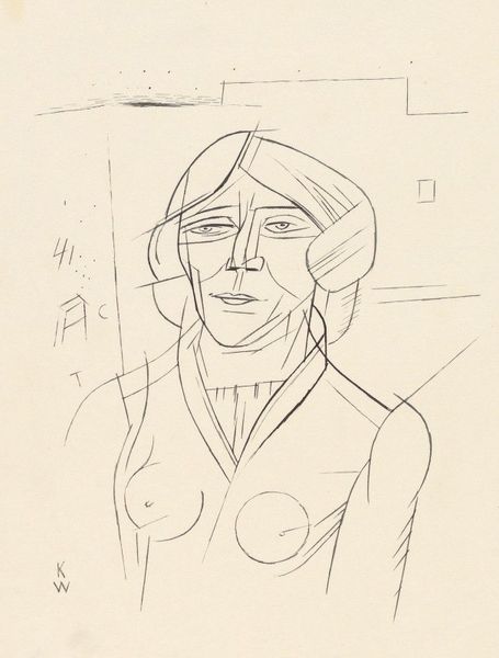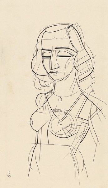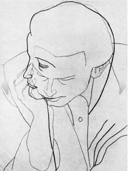 Karl Wiener made this drawing, Melancholie I, sometime before 1949 with ink on paper. It's all about the process of looking, isn't it? The lines are so direct, so economical. Each one feels essential, like a breath held and released. There's a real tension between the abstraction of the face and the emotional weight of that downturned gaze. Look at the forehead, how it's built from these intersecting lines, almost architectural in their precision, yet they fail to completely resolve into a readable form, dissolving instead into the surrounding space. The feeling here reminds me a little bit of Picasso's blue period drawings, a similar sense of sadness and introspection, but Wiener's mark-making feels more raw, more urgent. It's like he's trying to capture a fleeting emotion before it disappears altogether. Ultimately, this drawing is a reminder that art isn't about answers, but about asking the right questions, and maybe finding a little bit of beauty in the process.
