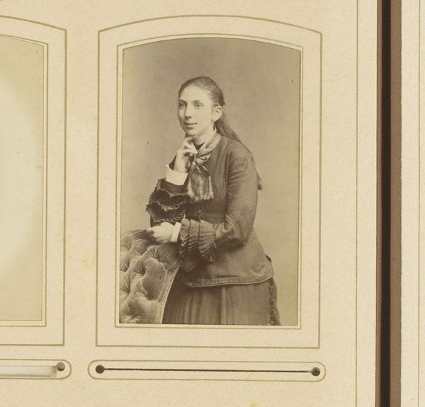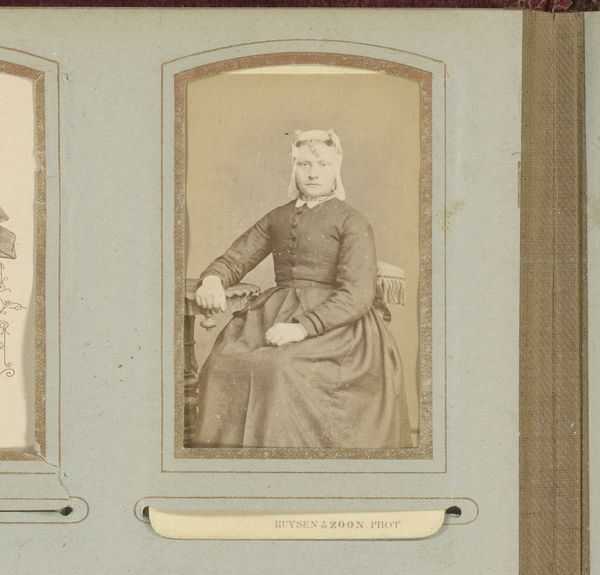 Joseph Maes captured this small portrait of a seated woman using the carte-de-visite photography method, a popular format for portraits during the mid-19th century. This image offers a glimpse into the representation of women during a time of significant social change. The woman's dark dress and serious demeanor reflect the Victorian ideals of modesty and restraint. Yet, her direct gaze and composed posture also suggest a quiet strength and self-awareness. Consider the historical context: as industrialization transformed society, women's roles were both idealized and constrained. While expected to adhere to domestic roles, many women were also becoming increasingly involved in social and political movements. How does this image reinforce or challenge those social expectations? This photograph captures a moment of quiet intensity, inviting us to reflect on the complex interplay between identity, representation, and societal expectations during the Victorian era.
